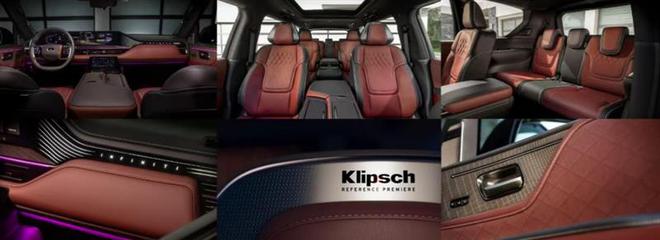车内则迎合当前的主流需求,采用大部分用户喜爱的双联屏设计,车内座椅采用定制的勃垦第红半苯胺真皮包覆,配合打孔菱形压纹★■■★,以及通风、加热◆■■◆、按摩功能★◆◆◆◆■,给予用户舒享体验★■■◆■。同时车内使用大量软质材料包覆★★■,以及激光雕刻实木饰板,带来视觉观感与实际触感多重高级体验。而在音响部分则采用美国教父音响品牌Klipsch杰士为全新QX80专属打造的24扬声器Reference Premiere音响系统★★■,带来震感且细腻的听觉享受。同时前排还搭载独立的头枕音响★★■★★◆,前后排互不干扰。